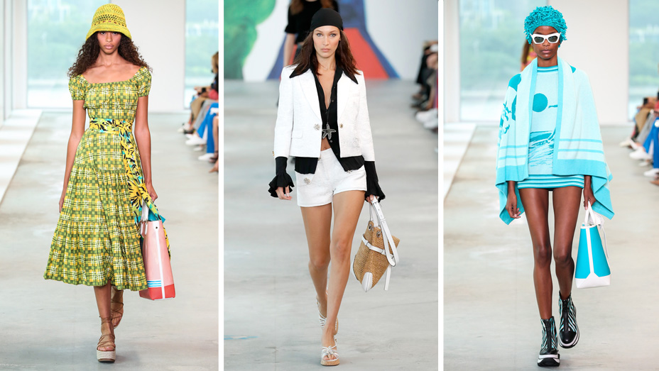 The bright florals, madras plaids and surfer-friendly knits for daytime were offset by looks that seem tailor-made for moments of evening poolside chic. Metallic brocade A-line dresses offered a touch of shimmer, and the sequined black jersey “bikini” gown Gigi Hadid wore as the final look easily could find its way to a Miami Art Basel party. Jackets also sparkled with oversized crystal buttons, while glittering starfish accented a bikini top or the waist of a floor-length skirt.